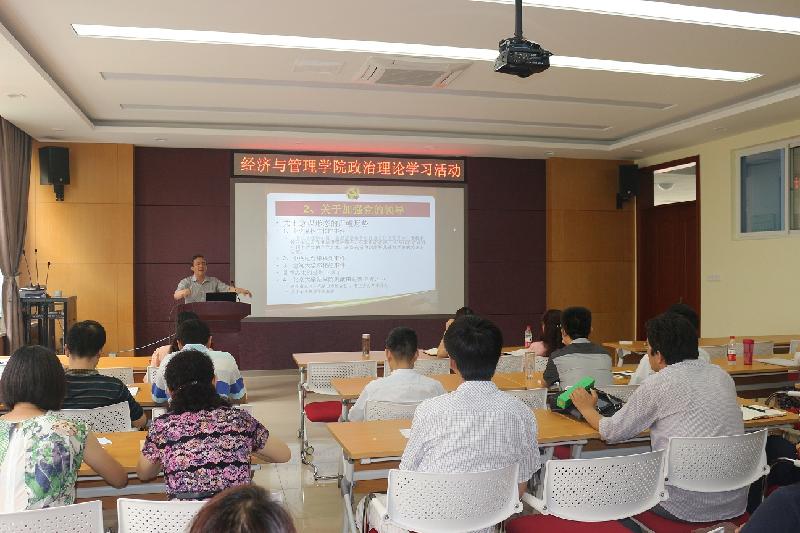 7月5日,经济与管理学院举办“两学一做”宣讲报告会,经济与管理学院分党委书记赵中利做主题为“从基础在学 到关键在做——从‘两学一做’谈加强基层党建工作的重要性”的宣讲报告,学院分党委成员以及全体教职工参加了此次会议。