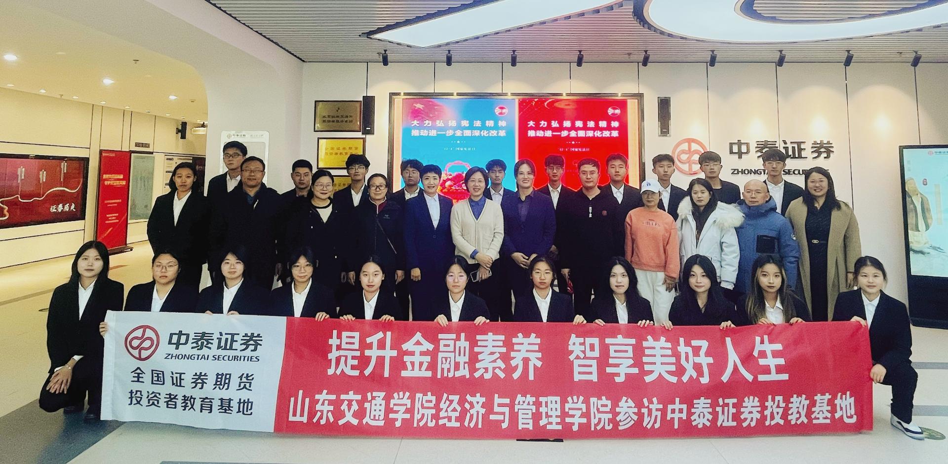 近日,经济与管理学院金融学卓越班赴中泰证券投资者教育基地(以下简称“基地”)开展“提升金融素养 智享美好人生”教学活动。经济与管理学院副院长聂云霞,中泰证券股份有限公司零售业务部总监于丽梅、平阴黄河路证券营业部总经理卓媛媛参加活动。