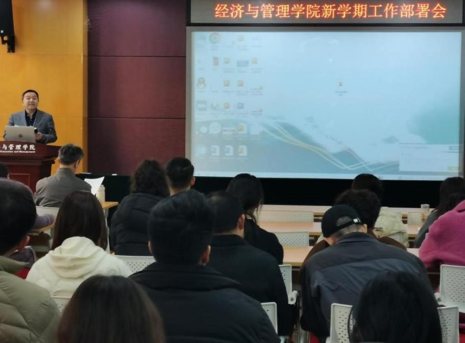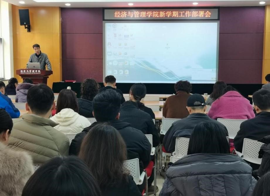 2月19日下午,经济与管理学院在1B104召开2025年新学期工作部署会议,学院领导班子成员及全体教职工出席会议。会议由学院党委书记赵晖主持。