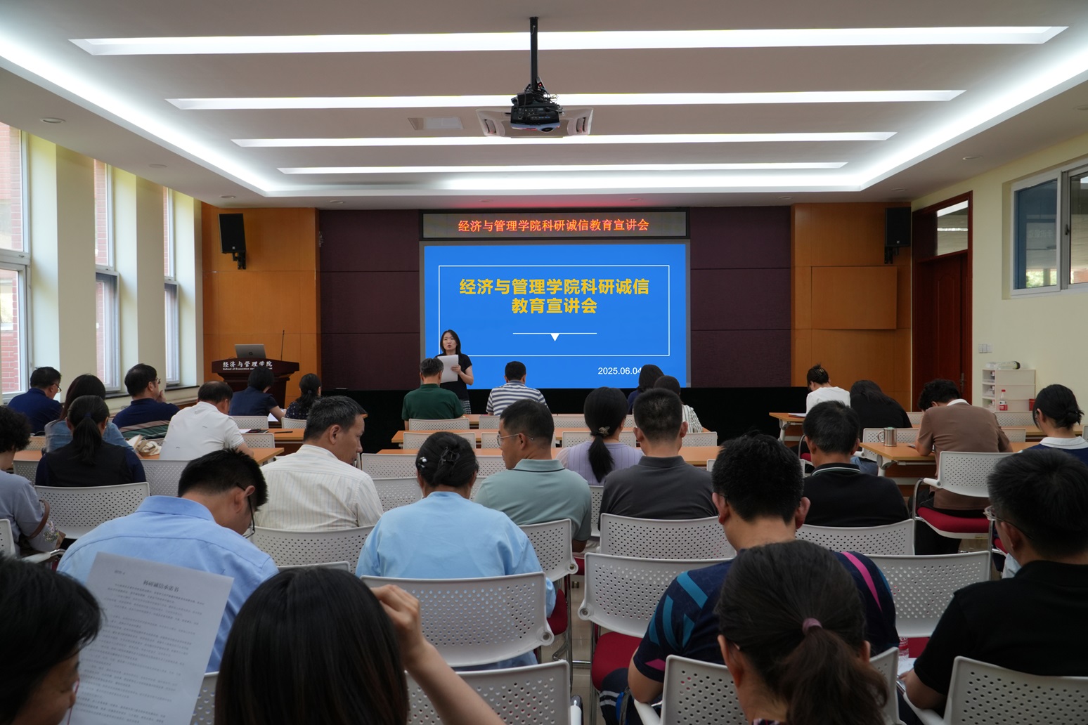 为扎实推进科研诚信体系建设,强化学术规范意识,经济与管理学院于6月4日下午召开科研诚信宣传教育专题会议。学院党政领导班子全体成员、专任教师及学生代表与会,副院长张蕾主持会议。