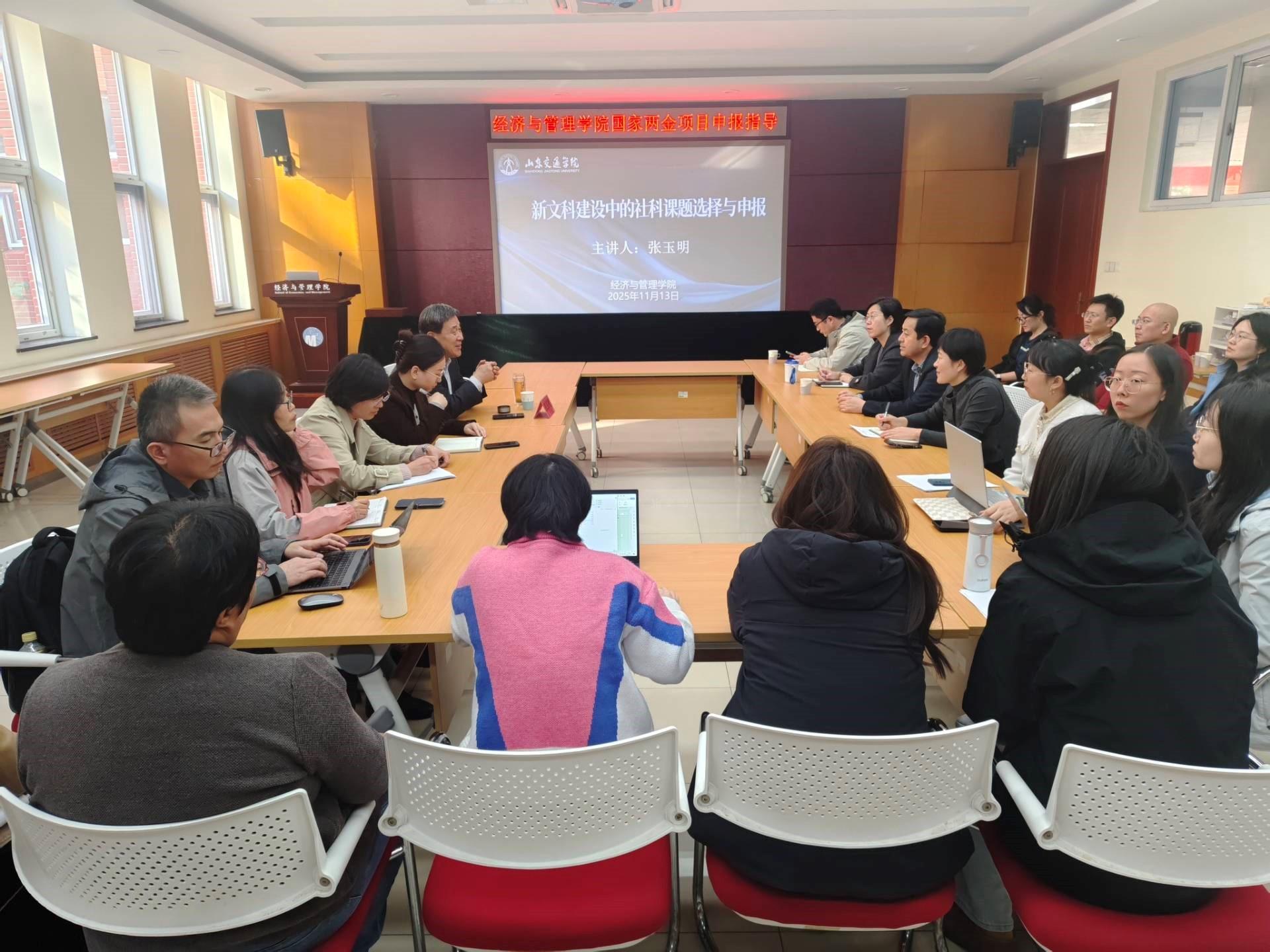 为进一步提升学院教师申报国家“两金”项目的质量,帮助教师更好地掌握申报技巧,11月13 日下午,我院在 1B104举行2026年度国家“两金”项目启动会暨选题指导会。本次辅导会邀请山东大学博士生导师张玉明教授担任主讲嘉宾。学院耿中元院长及科研骨干教师参会,李彩红副院长主持会议。